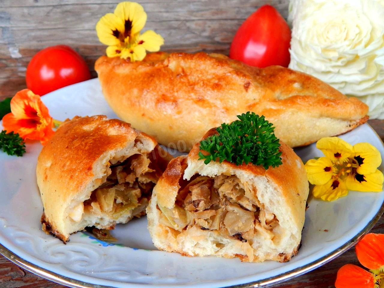 : Готові, рум'яні пиріжки, як пух на сухих дріжджах, дістаньте з печі і дайте їм трохи охолонути. Подавайте їх до столу із гарячим ароматним чаєм. Приємного апетиту!