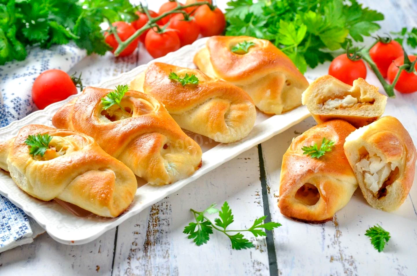 : Оберніть філе спочатку з одного боку, потім з іншого так, щоб розрізи потрапили в центр і трохи розкрилися. Зробіть так само й інші пиріжки. Я половину зліпила у різний спосіб, посилання на їх опис буде під рецептом.