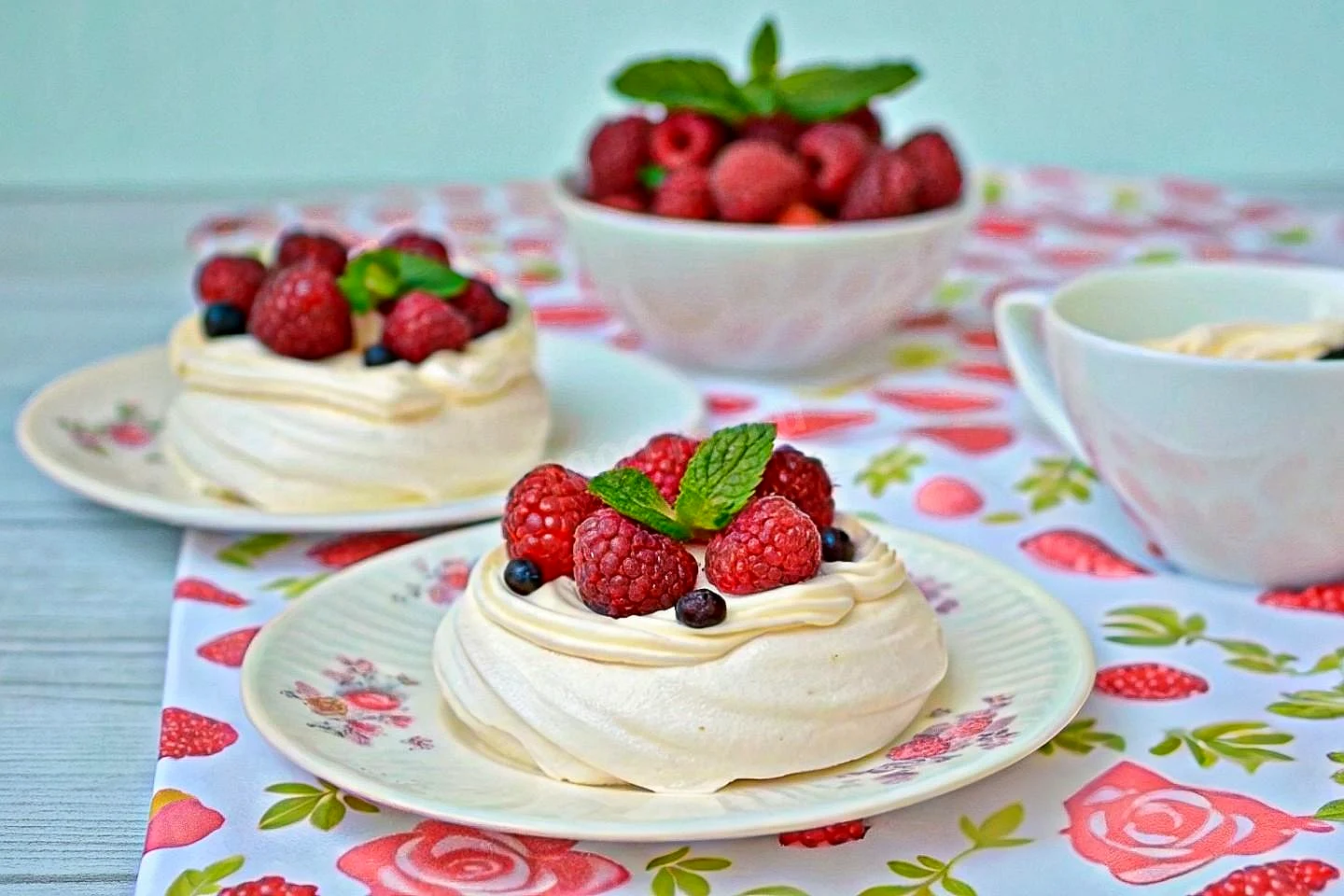 : Десерт украсьте ягодами. Свежие плоды нужно предварительно помыть и обсушить бумажными полотенцами. Замороженные ягоды разморозьте (обязательно слейте образовавшуюся от разморозки жидкость). Я использовала малину и чернику, вы можете брать любые ягоды по своему вкусу. Отлично сочетается со сливочным кремом вишня (без косточек), абрикосы, консервированные персики. Подавайте десерт к столу сразу, так как корзинки могут размокнуть от крема.