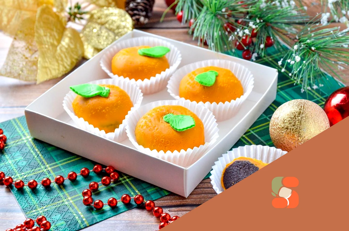 : Для надання фактури тістечку злегка притисніть його з усіх боків до найменшої сторони терки. З зеленої мастики зробіть плодоніжку та листочки мандарину. Заберіть тістечка в холодильник до повного розморожування.