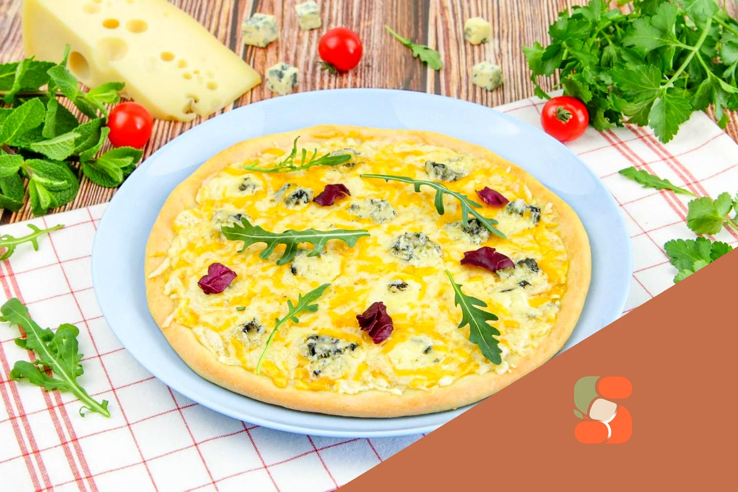: Готову піцу дістаньте з духовки, акуратно перенесіть на тарілку. Наріжте піцу 4 сири на шматочки і одразу подавайте до столу. Приємного апетиту!
