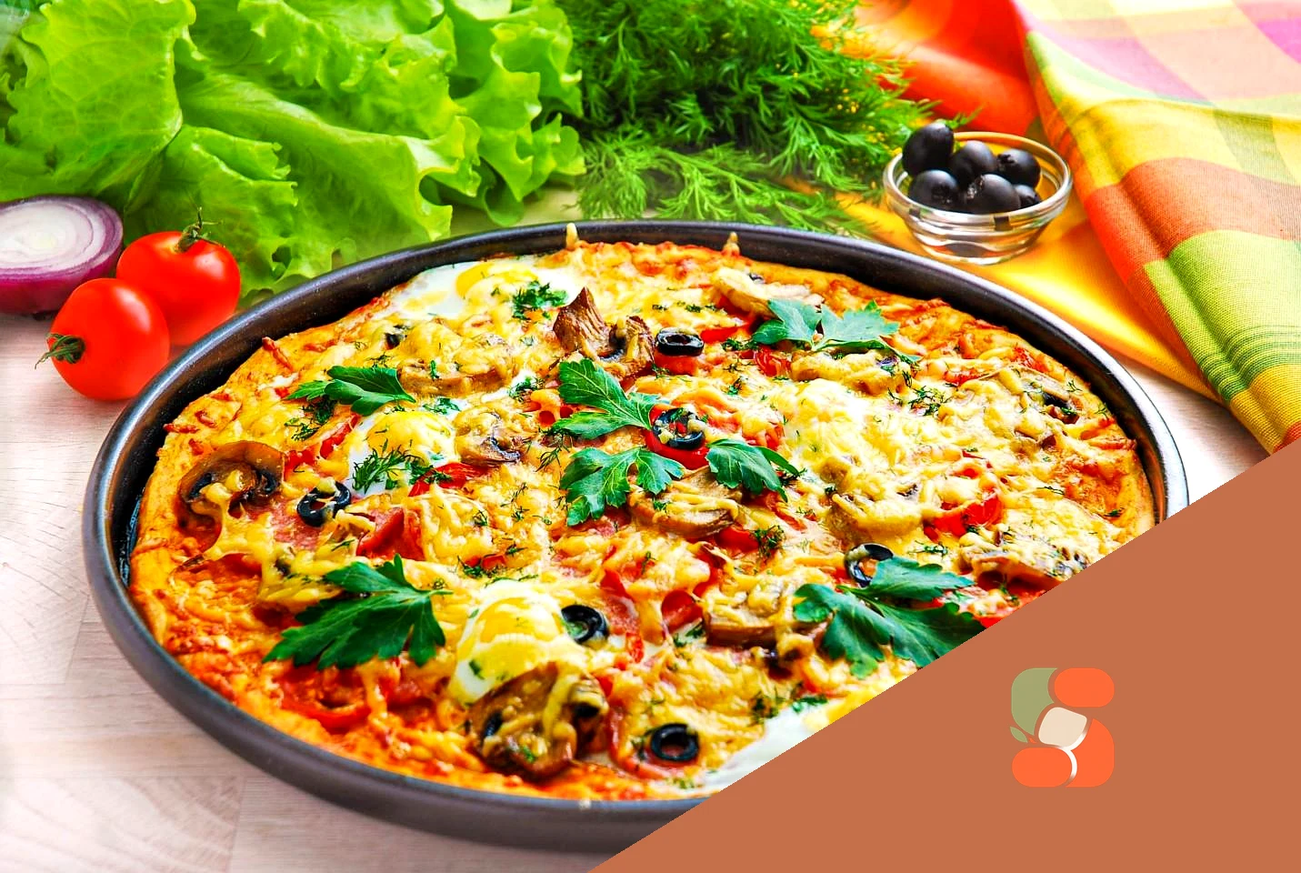: Дістаньте готову піцу з яйцем із духовки. Присипте будь-якою зеленню, наприклад, подрібненим кропом. Прикрасьте листочками петрушки. Подавайте у гарячому вигляді. Приємного апетиту!