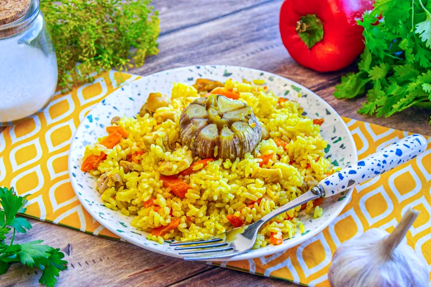 : Рис промойте несколько раз до чистой воды. Всыпьте рис в мультиварку, добавьте соль по вкусу, куркуму и любимые специи. Промойте чеснок и воткните в рис.