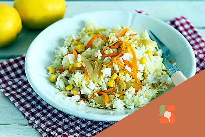Рис з овочами, консервованою кукурудзою та соком лимона
