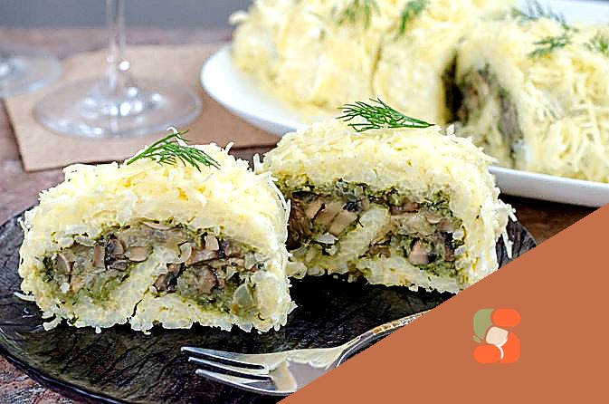 # Рисовий рулет з грибами, стручковою фасоллю та сиром Розкішний золотистий рулет з нежної рисової основи, заповнений ароматними обсмаженими грибами, яскравою стручковою фасоллю та розплавленим сиром…