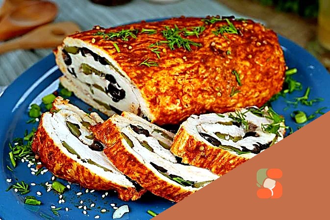 Рулет з індички, з маслинами та маринованими огірками