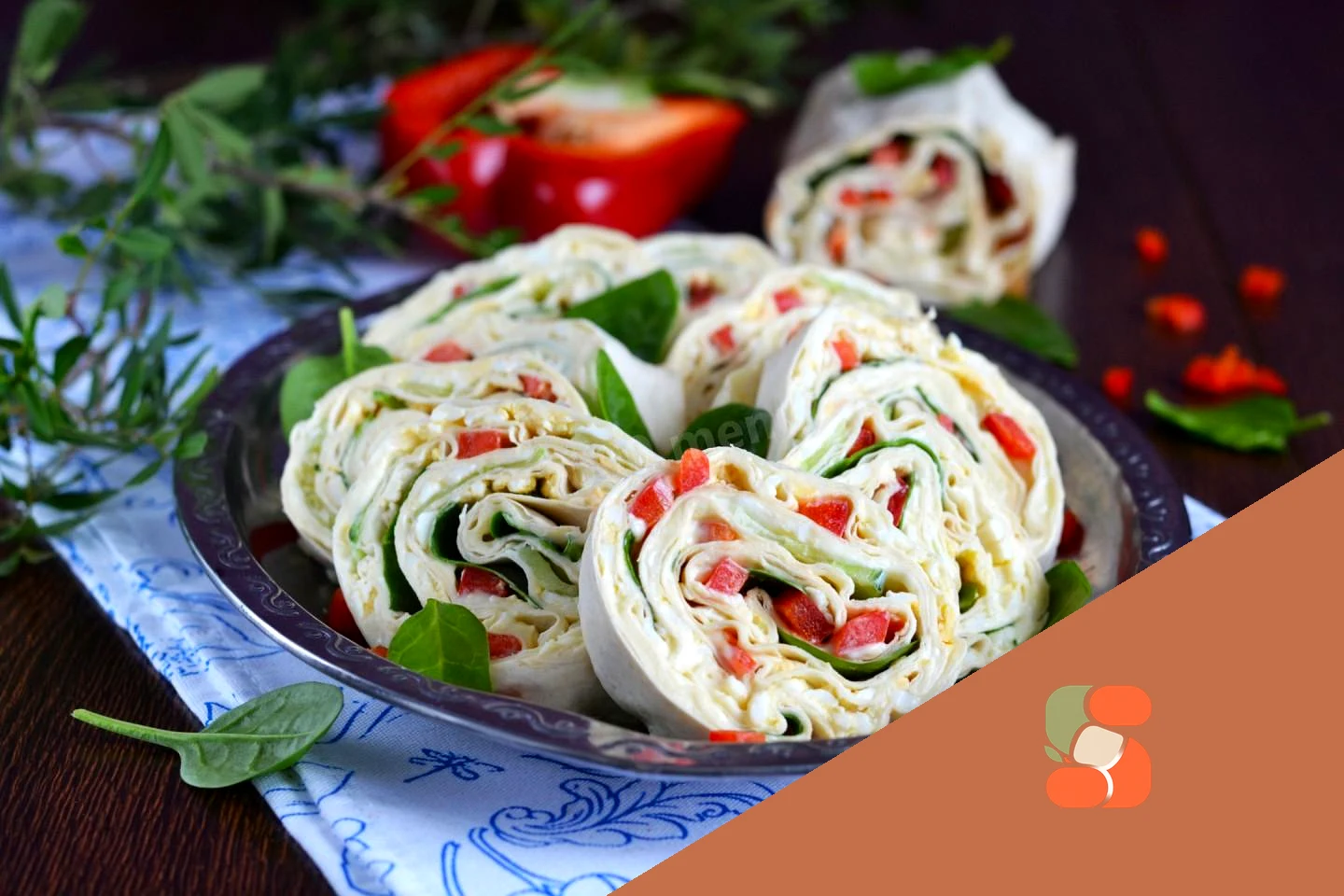 : Зверху накрийте другим листом лаваша і посипте тертими яйцями, що залишилися, і болгарським перцем. Зверху розкладіть листочки базиліка або шпинату.