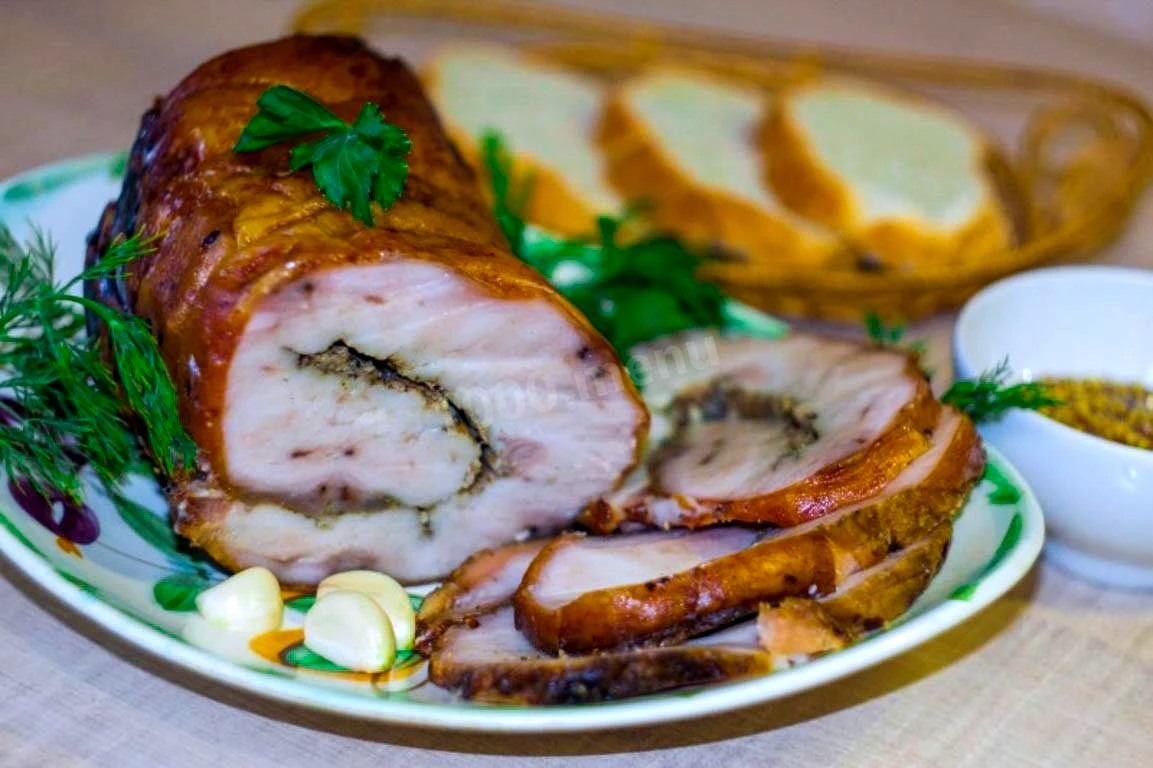 : Вийміть рулет з холодильника, звільніть його від ниток і наріжте. Дуже смачно подавати його з першими стравами, а також з картоплею. Для кращого травлення його краще їсти вприкуску з гірчицею або хроном.