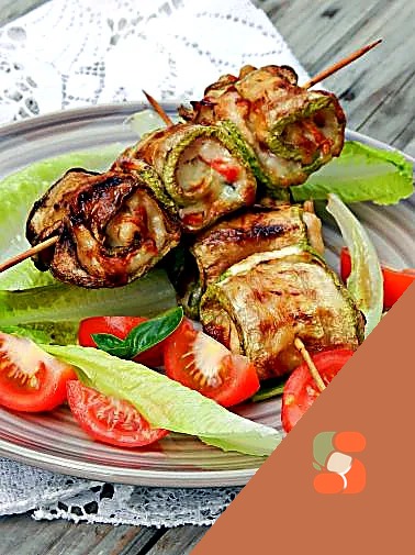 Скрутити рулетики з кабачків, заколоти їх дерев'яними шпажками і запекти в аерогрилі при 190 градусах 30 хвилин, у процесі запікання перевернути один раз. (У духовці запікати так само, можна не перевертати.)