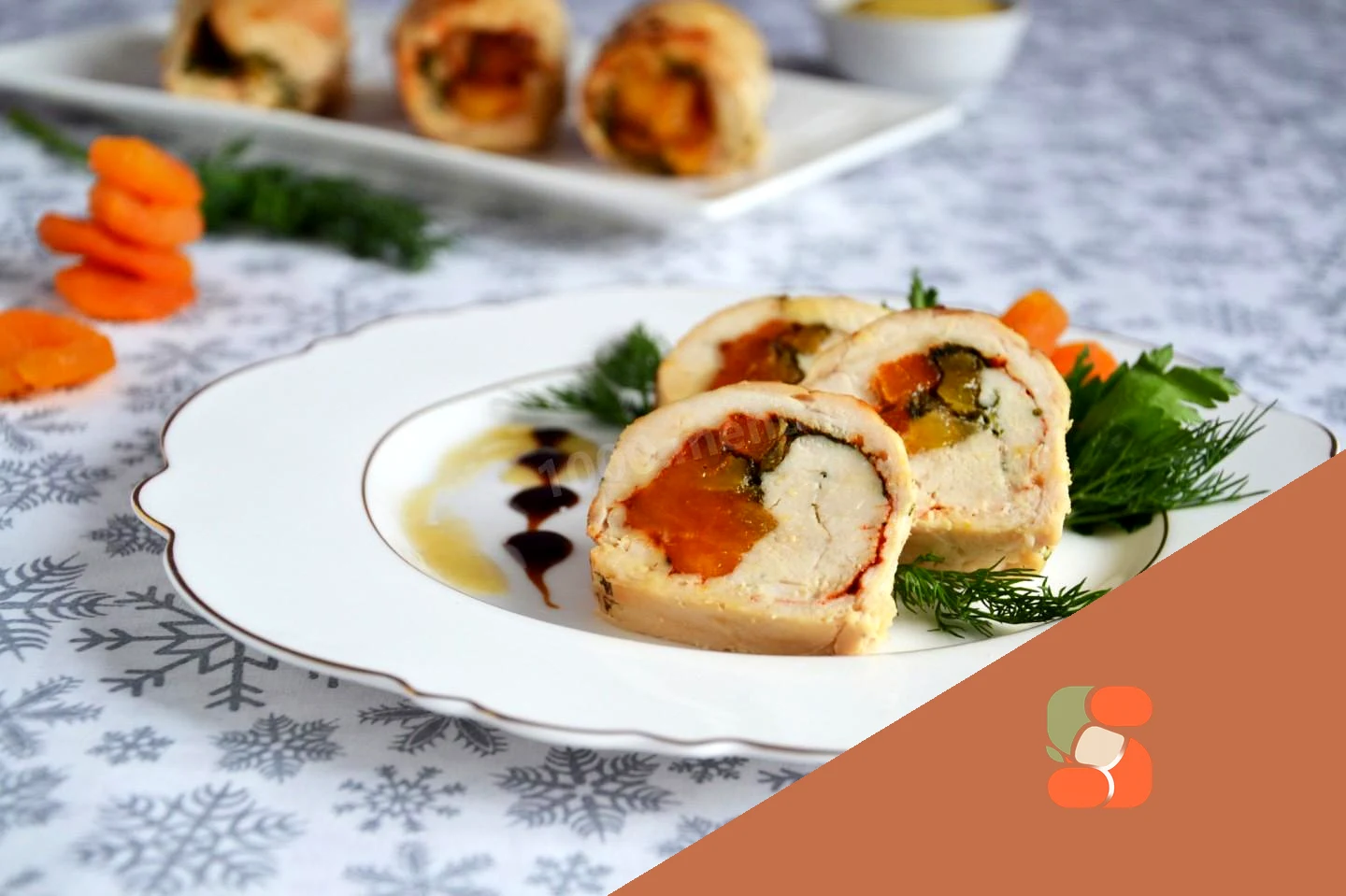 : На край кожної скибочки філе викладіть трохи кураги, поруч розподіліть рубану зелень.