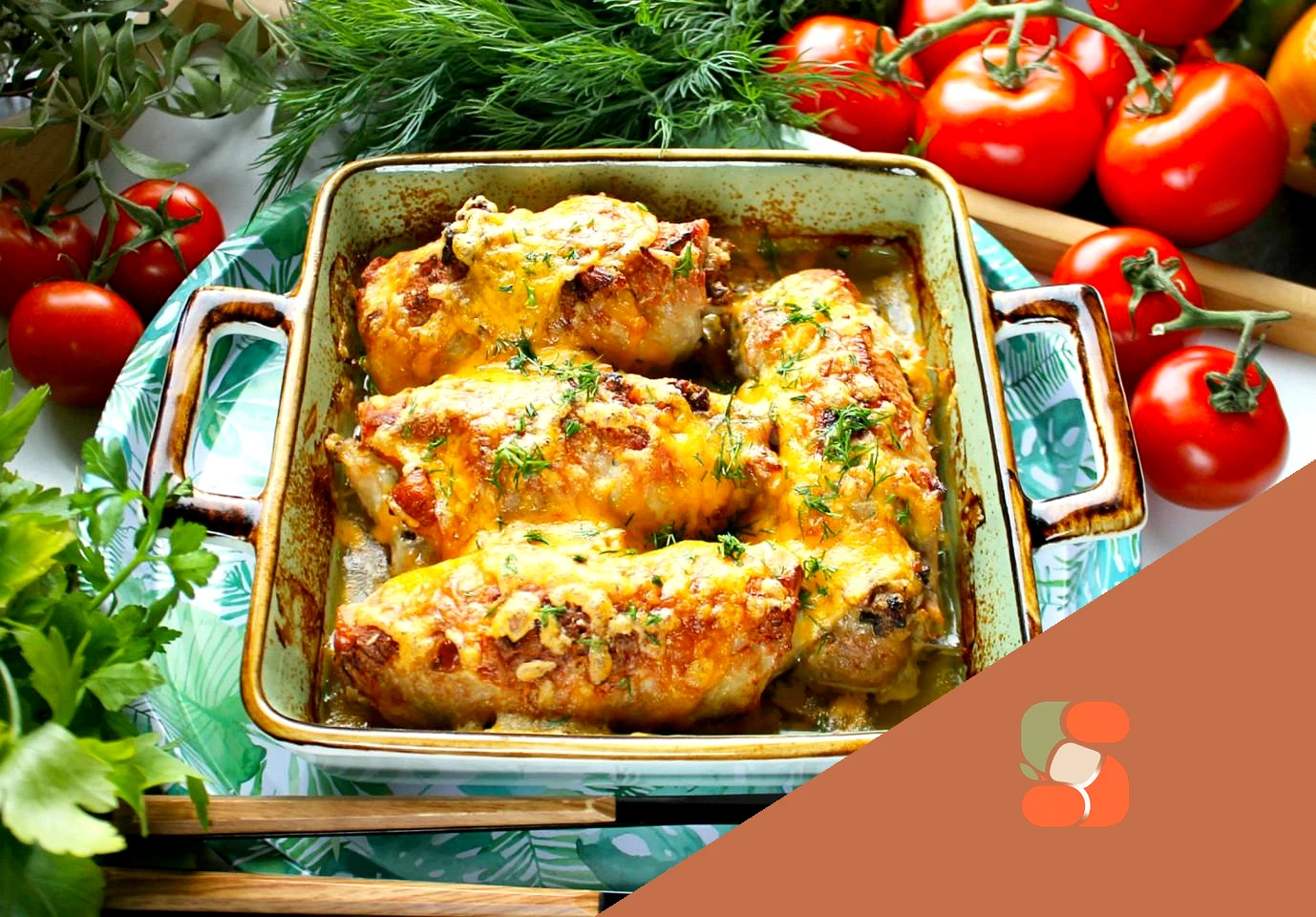 : Викладіть готові свинячі рулети у форму для запікання. Дно форми я не змащу рослинною олією, в процесі запікання його утворюється достатня кількість від начинки та сметани, тому рулетики не пригорають.