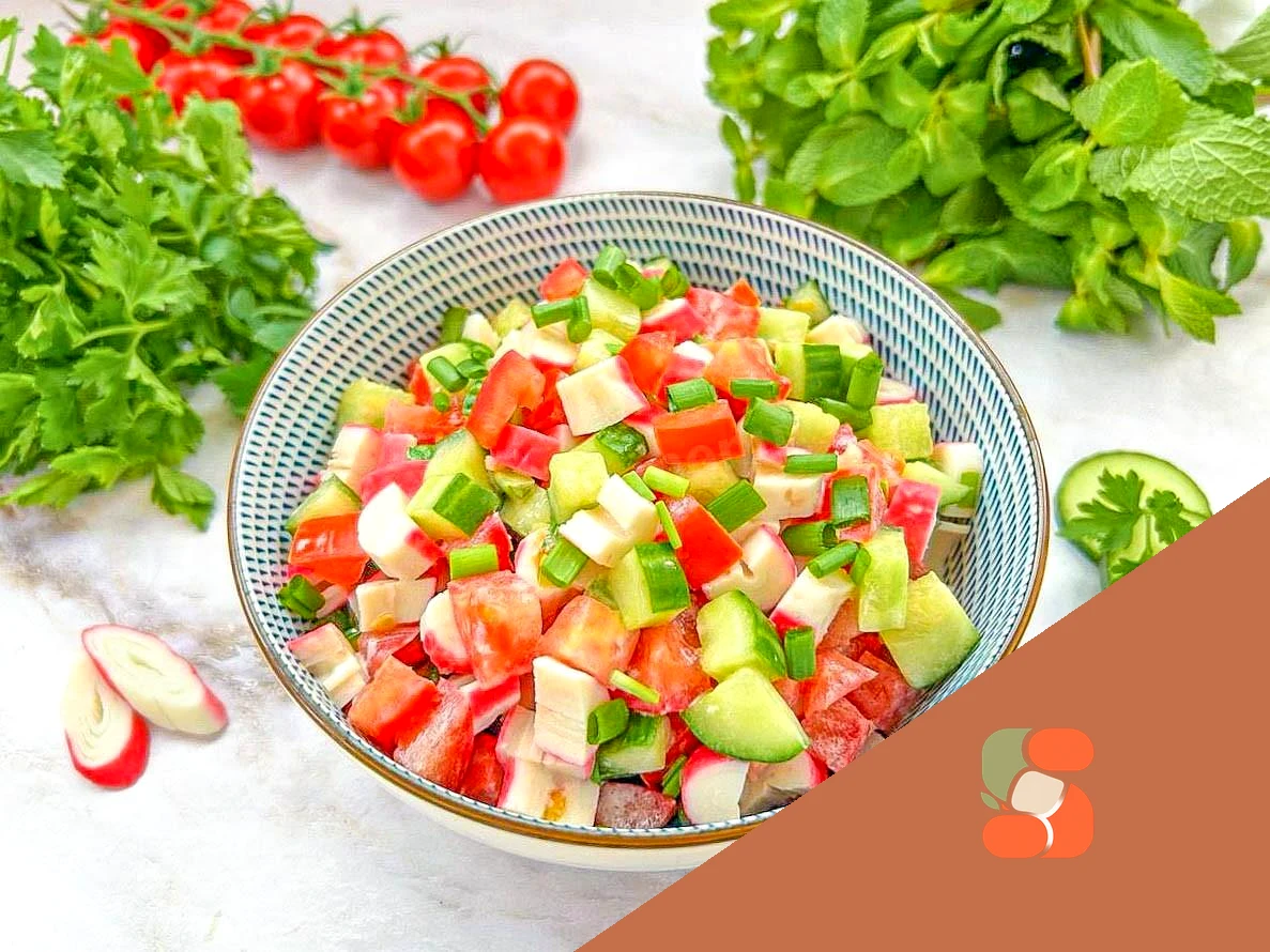 Як зібрати та заправити салат? У глибокій мисці з'єднайте нарізані крабові палички, огірок, помідори та зелену цибулю. Часник пропустіть через прес або дрібно наріжте. Додати до нарізаних інгредієнтів. Посоліть до смаку. Додайте майонез, ретельно перемішайте. Майонез можна використовувати як покупний, так і домашній. Рецепти домашнього майонезу можна знайти після опису останнього кроку. Чим замінити майонез у салаті? Для заправки салату можна взяти сметану або грецький йогурт.