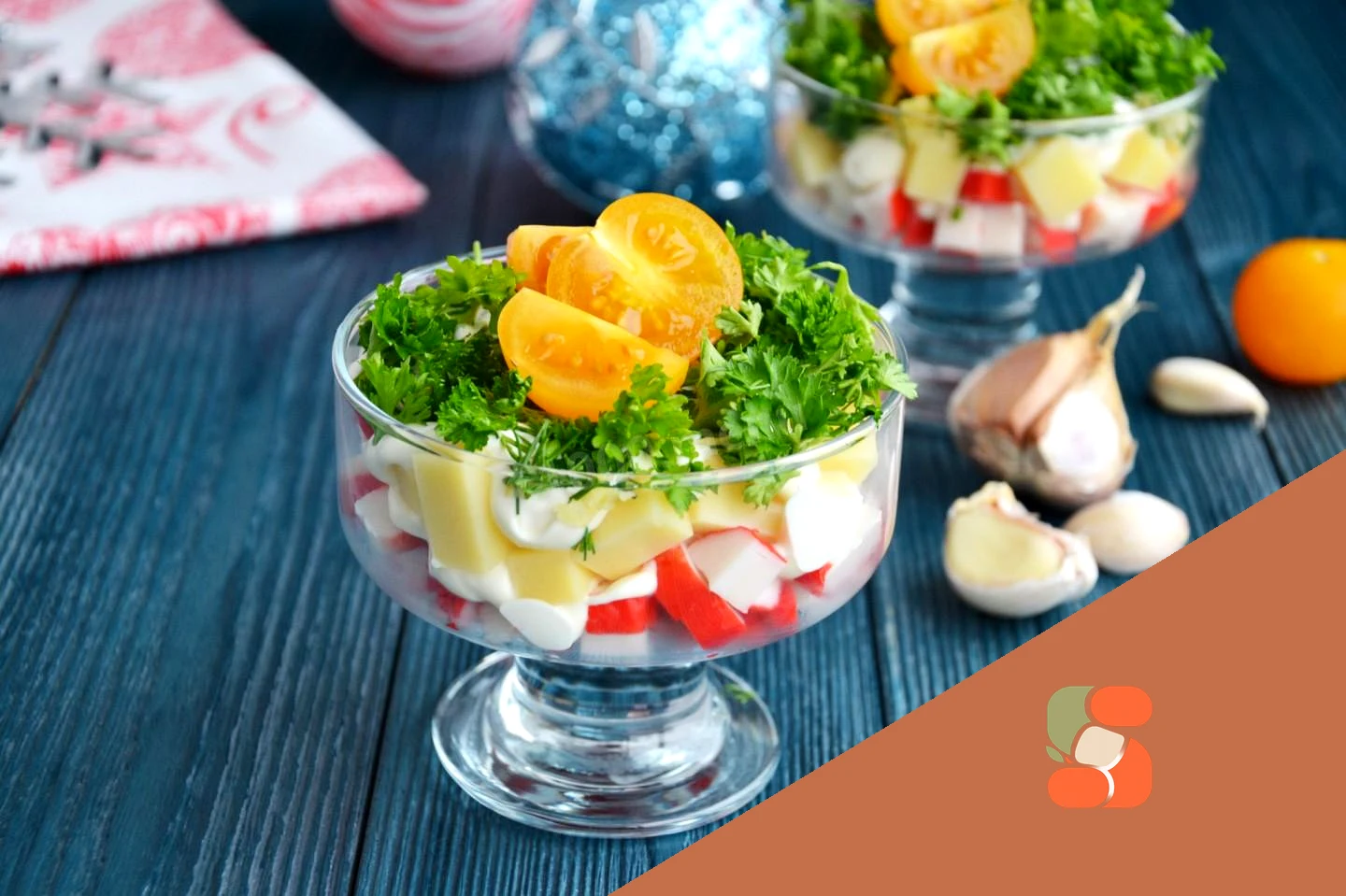 : Підготуйте креманки. Першим шаром викладіть крабові палички.