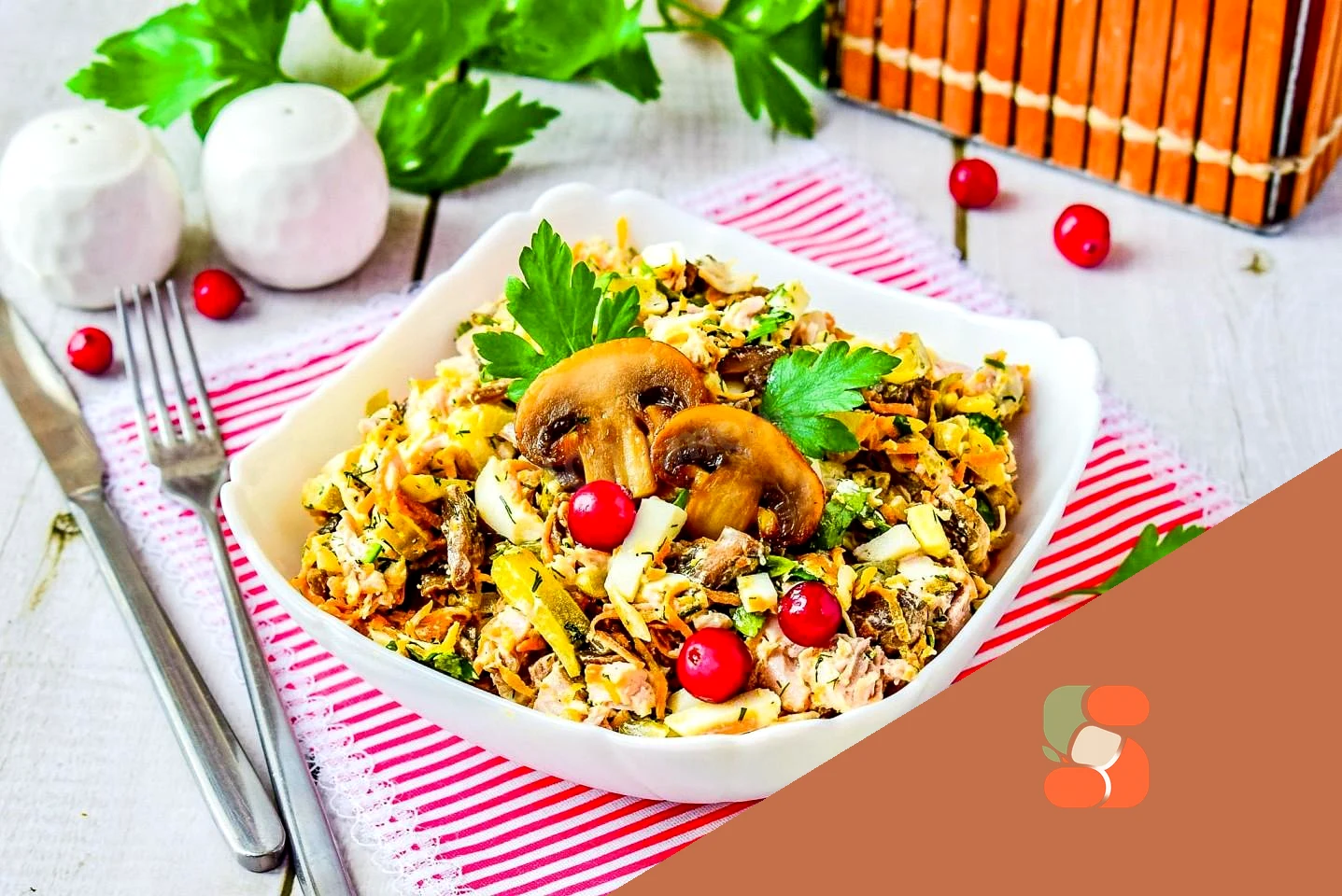 : Салат з куркою, грибами та морквою готовий! Трохи його охолодіть. Перед подачею викладіть салат у відповідний салатник. Приємного апетиту!