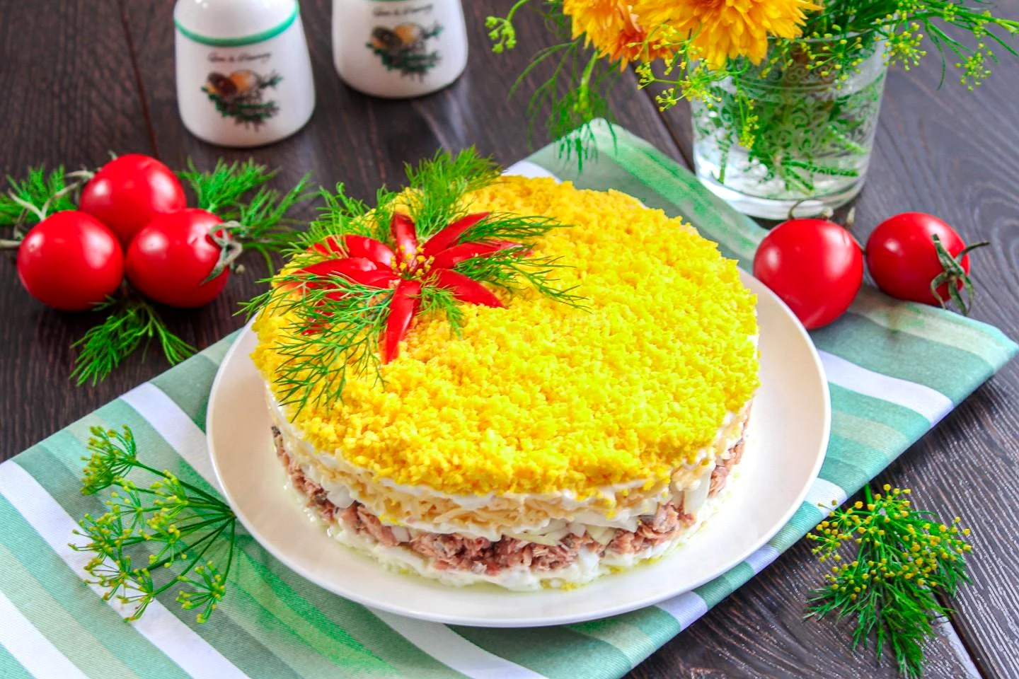 : Візьміть відокремлені спочатку жовтки і натріть їх на тертці, потім акуратно розподіліть по всій поверхні салату, цей шар буде завершальним. Акуратно зніміть роз'ємну форму, прикрасьте салат на свій смак, я використала для прикраси свіжі помідори та кріп. Дайте настоятися страві в холодильнику протягом години, а потім можете подавати салат до столу. Приємного апетиту!