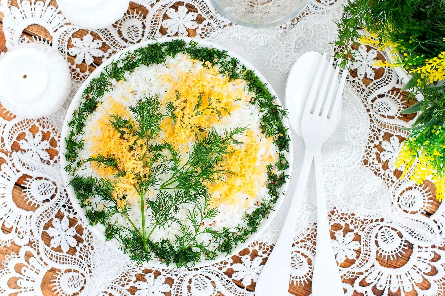 : Желток натрите на мелкой тёрке и выложите на укроп, имитируя цветки "Мимозы". Делать такое украшение не обязательно. Можно просто промазать слой с яичными белками майонезом и вложить заключительным слоем натёртые на мелкой тёрке желтки.