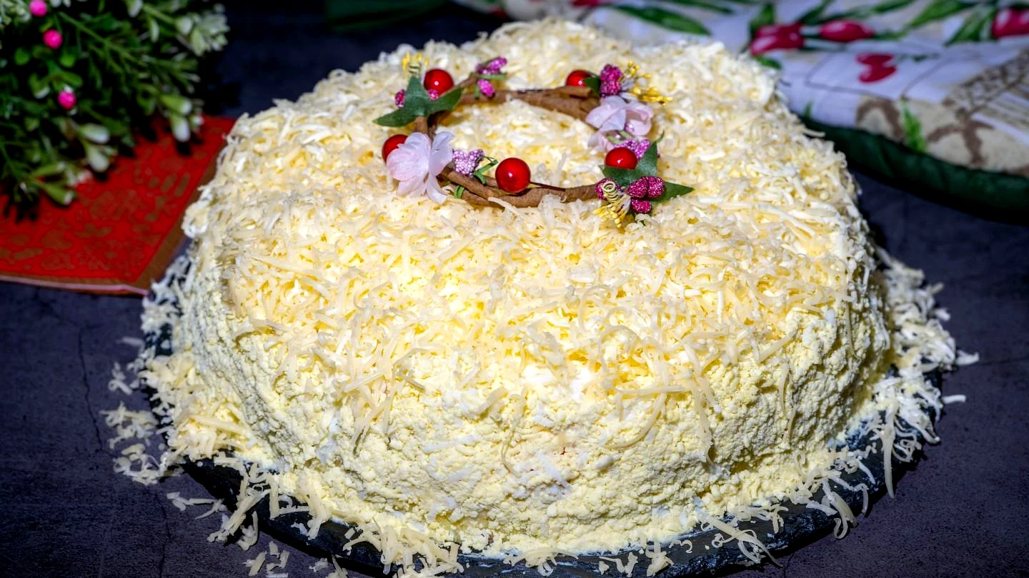: Черговим шаром викладайте натертий яєчний білок і рівномірно його розподіляйте зверху та боків салату.