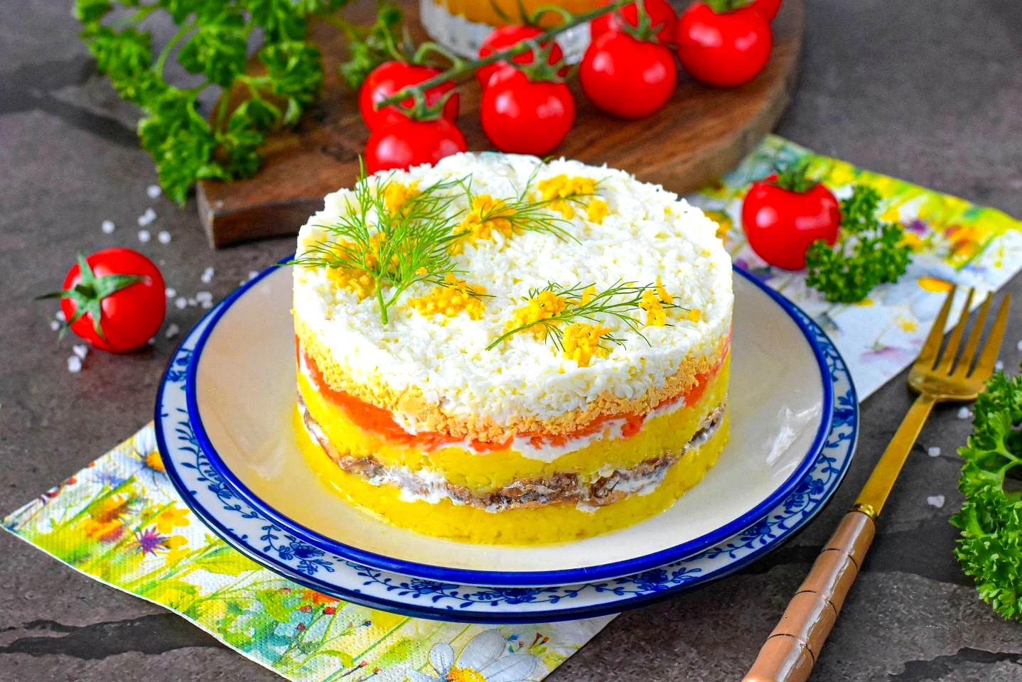 Скільки часу потрібно, щоб салат Мімоза просочився? Поставте салат на 30 хвилин у холодильник для просочення. Кулінарне кільце зніміть.