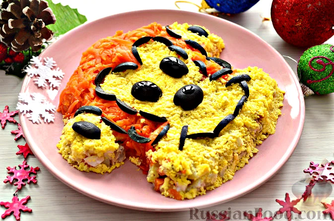 З решти салату викладаємо вушка, мордочку. У процесі допомагаємо укладати салат лопаткою.