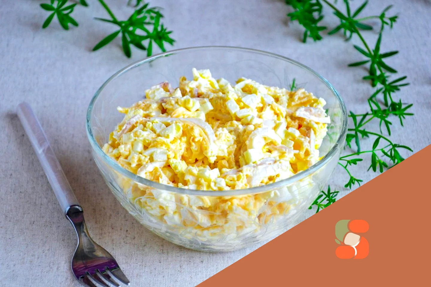 : Яйця відваріть Як зварити яйця круто? Покладіть в холодну воду, поставте варити на невеликий вогонь. Варіть яйця 9 хвилин після закипання, потім залийте холодною водою та остудіть. Від різкого перепаду температур шкаралупа краще очиститься. Охолодіть та очистіть їх від шкаралупи. Наріжте невеликими кубиками.