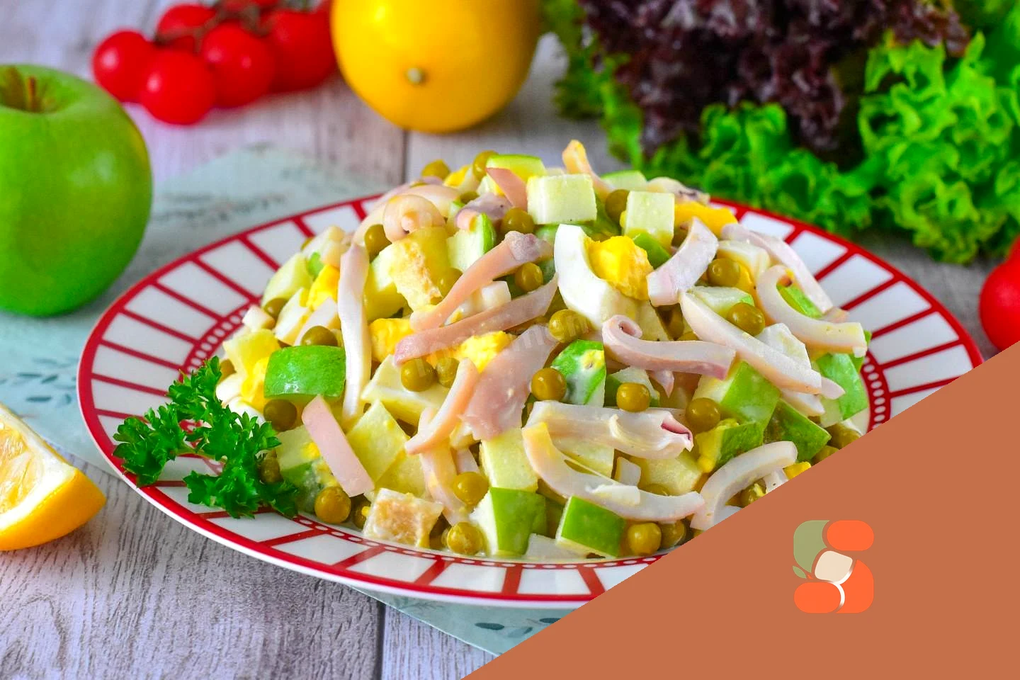 : У мисці з'єднайте кальмари, яйця, яблуко та горошок Салат заправте майонезом та перемішайте. Потім заберіть на 10-15 хвилин у холодильник.