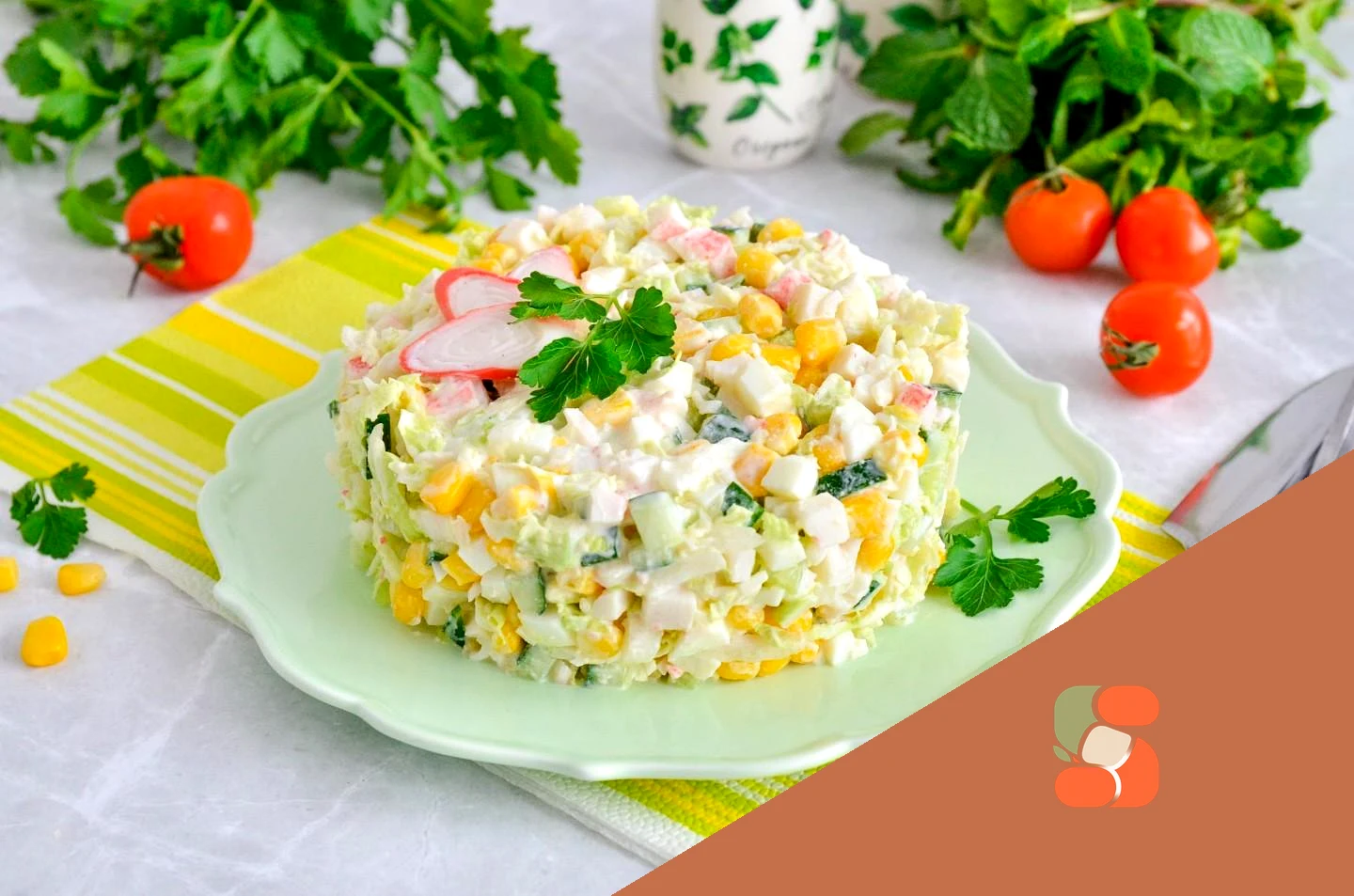 : Салат пекінська капуста, огірок, крабові палички, кукурудза готовий. Ви можете подати його в салатнику або на тарілці, виклавши за допомогою кулінарного кільця. Приємного апетиту!