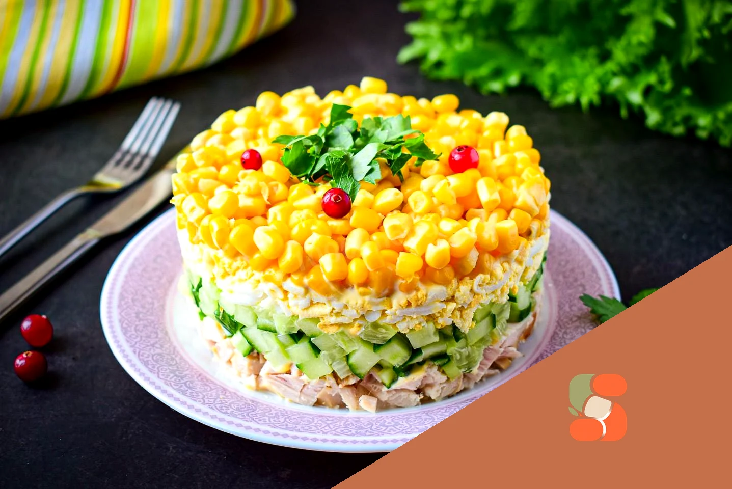 : Останнім шаром буде йти консервована кукурудза Злийте зі баночки всю рідину і викладіть кукурудзу зверху салату. Акуратно зніміть кільце сервіровки. Перед подачею салат трохи охолодіть у холодильнику. Готовий салат подавайте до столу, прикрасивши свіжою зеленню. Приємного апетиту!