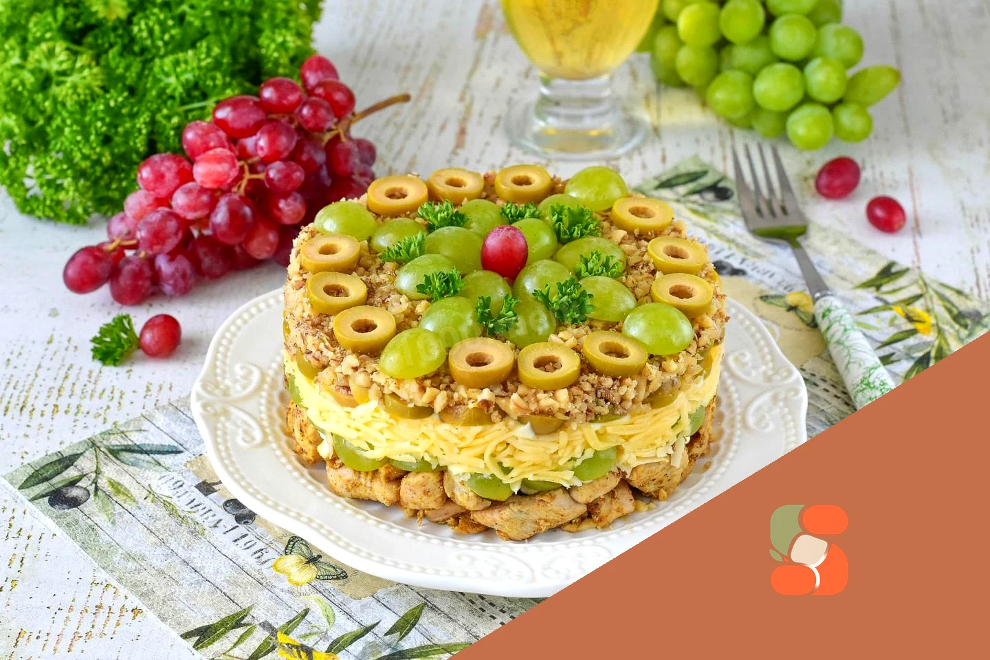 Як шарувати салат з куркою і сиром? Куряче філе викласти в деко (у мене 14 см в діаметрі) або в глибокий салатник і змастити майонезом. Далі розподіляємо половинки винограду. Поливати цей шар майонезом не потрібно, виноград і так соковитий. Далі викладаємо сир і поливаємо його майонезом. На сир викласти оливки і полити майонезом. Останній шар викласти волоськими горіхами. Прикрасити половинками винограду, оливками і петрушкою. Дайте салату постояти в холодильнику 1 годину.
