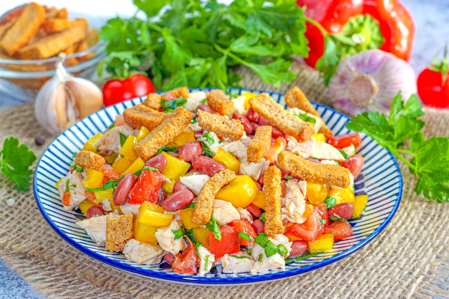 Як зібрати та заправити салат? У глибокому салатнику поєднайте всі підготовлені інгредієнти з квасолею. Додати соєвий соус, оливкову олію, чорний мелений перець. Якщо у вас дуже насичений соєвий соус, додайте менше (приблизно 1 ст. л.), т.к. сухарики солоні, і можна пересолити салат.