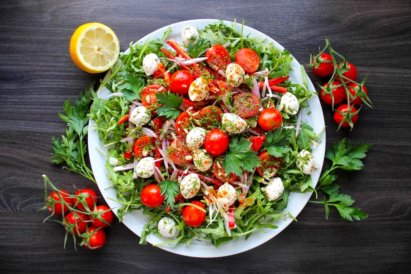 Чим заправити салат з помідорами та руколою? Салат посоліть до смаку, посипте за бажанням меленим перцем. Я зазвичай використовую запашний та червоний перець. Полийте зверху оливковою олією і додайте сік свіжого лимона за бажанням (замість лимона можна використовувати лайм).