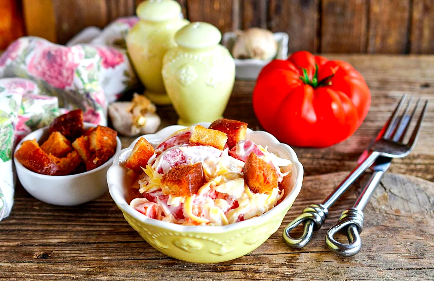Салат з помідорами сиром та сухариками.