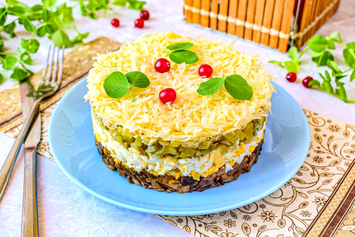: Верхнім шаром салату викладете сир, натертий на тертці Трохи його притисніть щільніше і знімайте кільце сервіровки. Салат печериці, сир, яйця готовий. Трохи охолодіть його перед подачею. Прикрасьте салат на власний смак. Приємного апетиту!