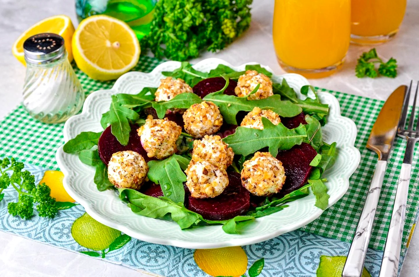 : Рукколу помийте і добре обсушіть паперовими рушниками - від зайвої вологи зелень швидко втрачає вигляд. Викладіть листя на блюдо, довгі можете порвати руками, щоб їх було зручно їсти. Зверху розкладіть кружечки буряків та сирні кульки. Полийте салат зверху заправкою, що залишилася.