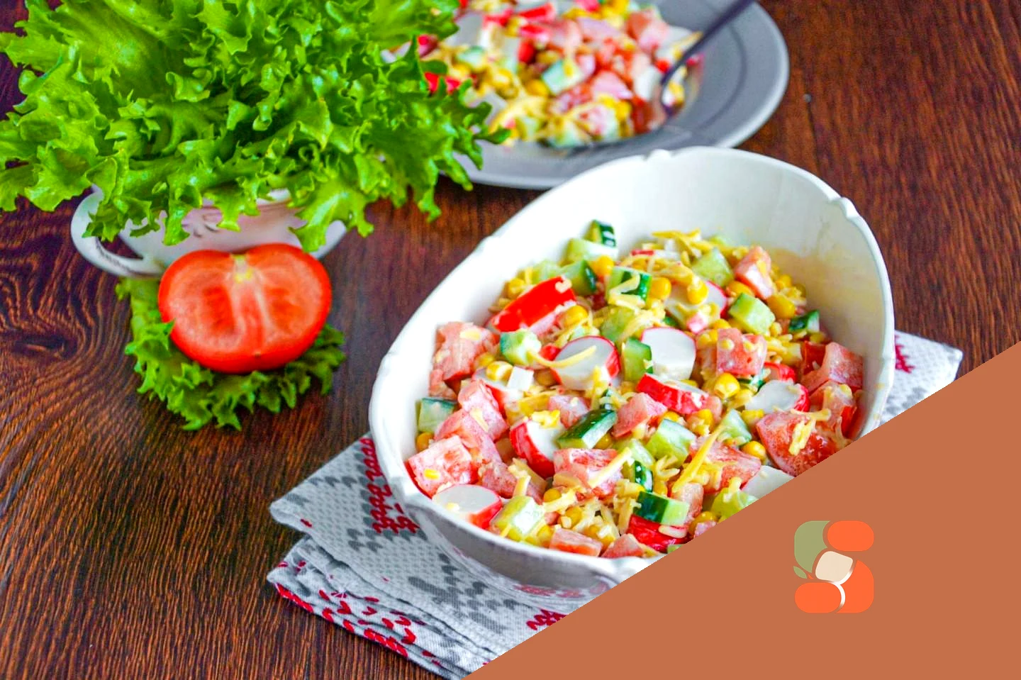 Як правильно нарізати крабові палички та підготувати кукурудзу? Крабові палички наріжте невеликими кубиками. З консервованої кукурудзи злийте рідину. Про те, як правильно вибрати крабові палички та кукурудзу, читайте наприкінці рецепту. Чим замінити крабові палички у салаті Весняний бриз? Крабові палички можна успішно замінити на відварене куряче філе, консервований тунець або відварні креветки.