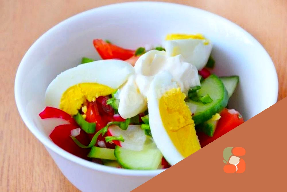 : У салатниці перемішайте черемшу з помідорами, огірками, редисом та цибулею Все це - підсоліть до смаку. Для оформлення подачі нам також знадобляться відварені круто яйця: 2-3 курячих або 8 перепелиних. Я взяла для цього рецепту звичайні курячі, але іноді використовую перепелині.