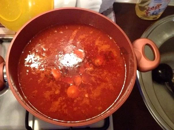 : Тепер настав час додавати томатний сік Я беру спочатку 350-500 гр (0.5 пакети) і заливаю до м'ясної суміші в МВ, все перемішую, закриваю кришку і включаю режим "гасіння" на 1 год (це стандартний час, але я вважаю, що це занадто багато)