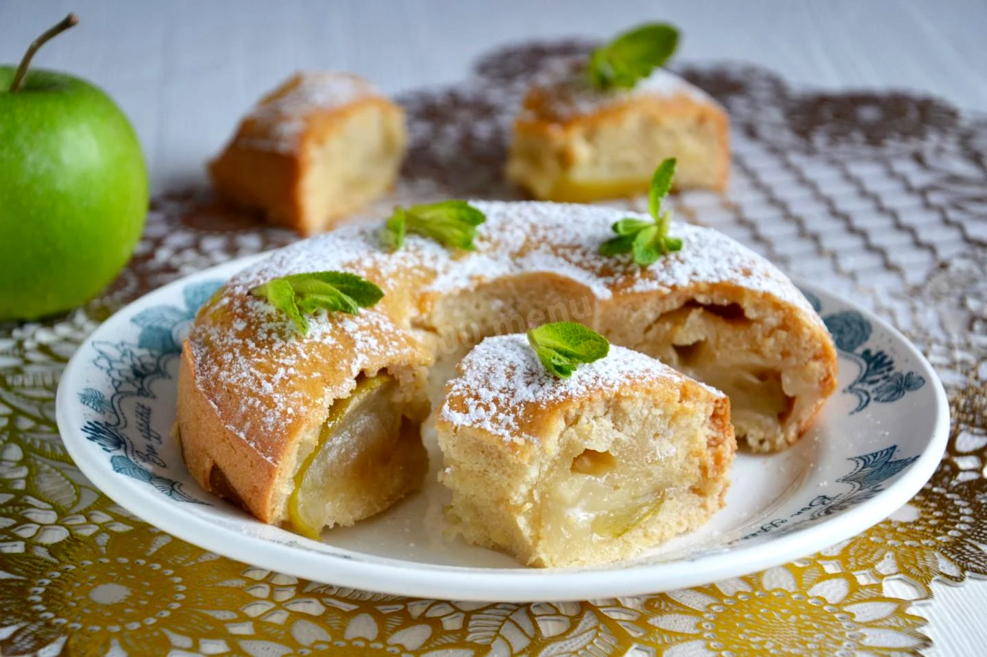 : Готовую шарлотку переложите на блюдо, сверху смажьте оставшимся медом, нарежьте на кусочки и подавайте к столу. Я еще для красоты посыпала сахарной пудрой. У шарлотки получается хрустящая корочка, а внутри она влажная из-за яблок.