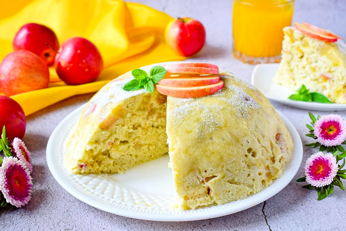 : Извлеките шарлотку из чаши и снимите с него пленку. Если вас смущает белый цвет пирога, то можно его полить шоколадом. Но, на мой взгляд, шоколад будет перебивать вкус яблок. Поэтому я посыпала сахарной пудрой. Сам пирог получается нежнее и влажнее, чем из духовки. Нам очень нравится! Угощайтесь и вы!