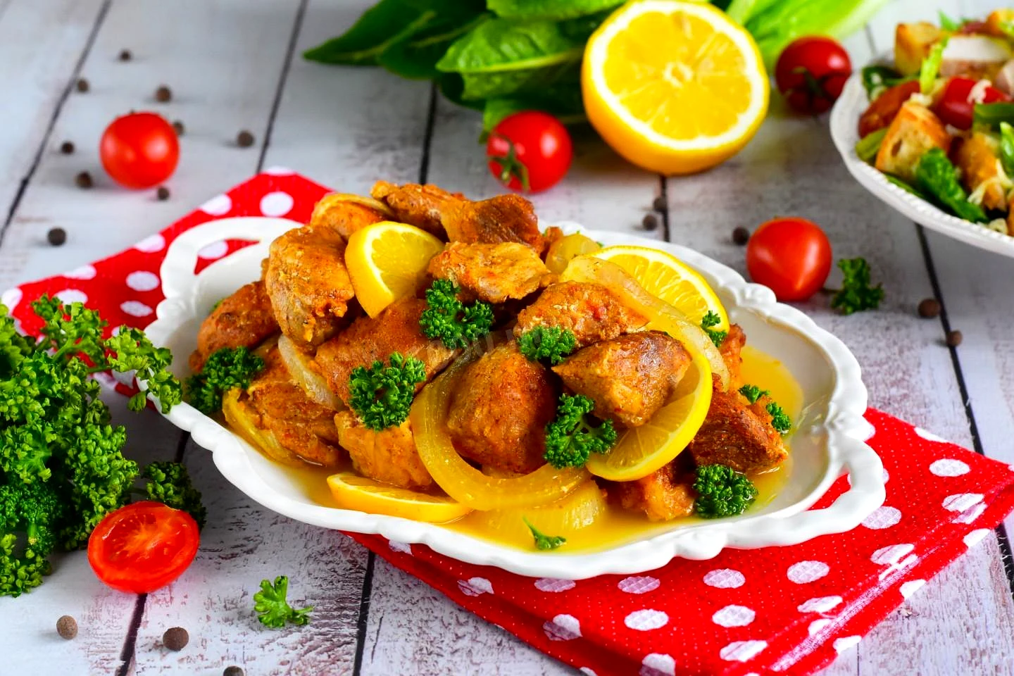 : Свинину вимийте, обсушіть та наріжте порційними шматками. Викладіть м'ясо у миску. Всипте спеції для м'яса, перець і сіль (якщо сіль вже входить до складу суміші спецій, додатково її додавати не потрібно). Влийте 1 ст. л. оцту та лимонний сік. Все ретельно перемішайте.