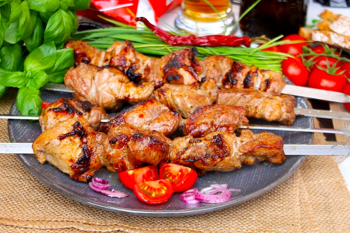 : Готовий шашлик подавайте зі свіжими овочами та свіжою зеленню Доповніть його улюбленим соусом. Приємного апетиту!