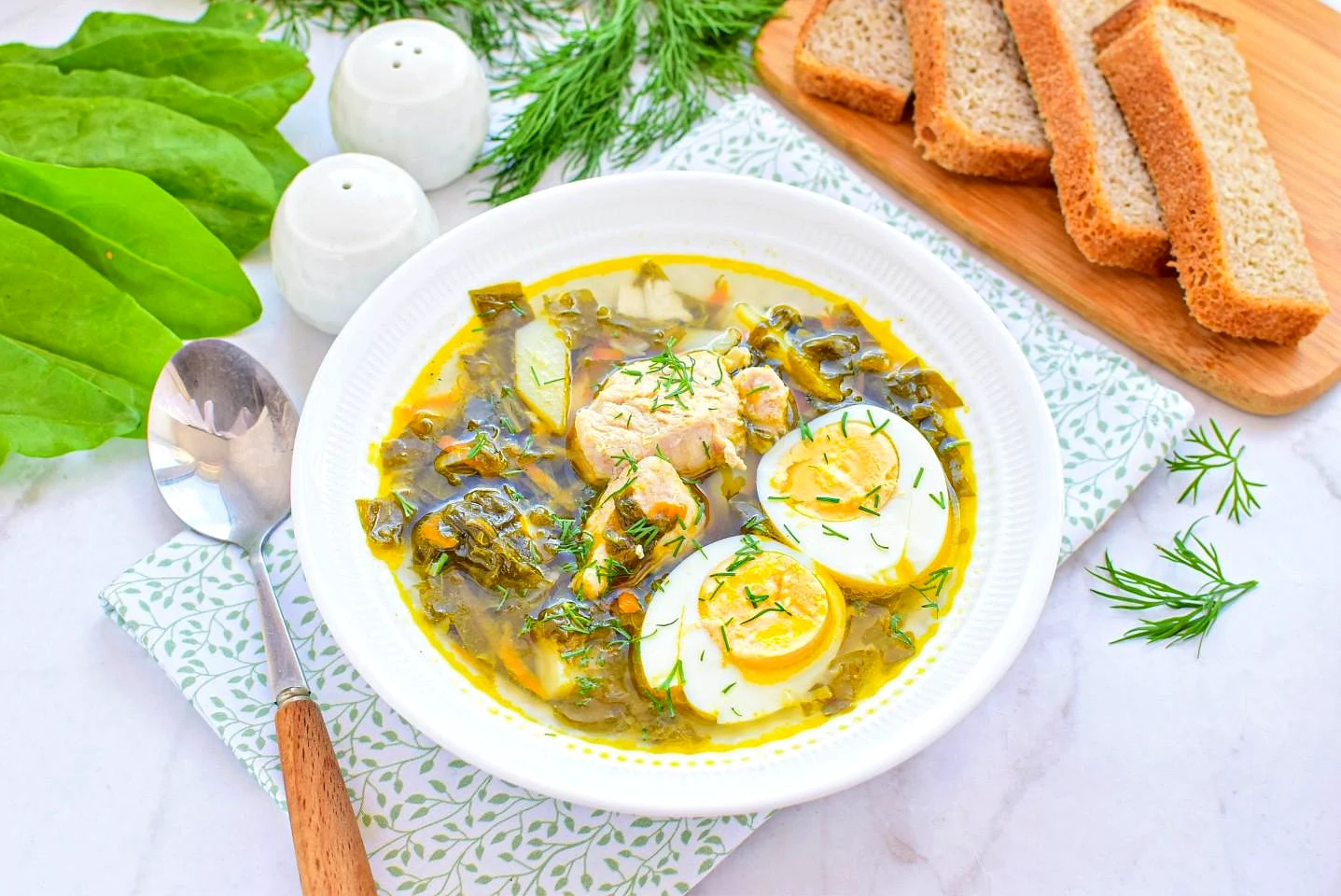 : Щавельний борщ готовий Розлийте зелений борщ по тарілках, додайте відварене яйце та подавайте до столу у гарячому вигляді. Приємного апетиту!