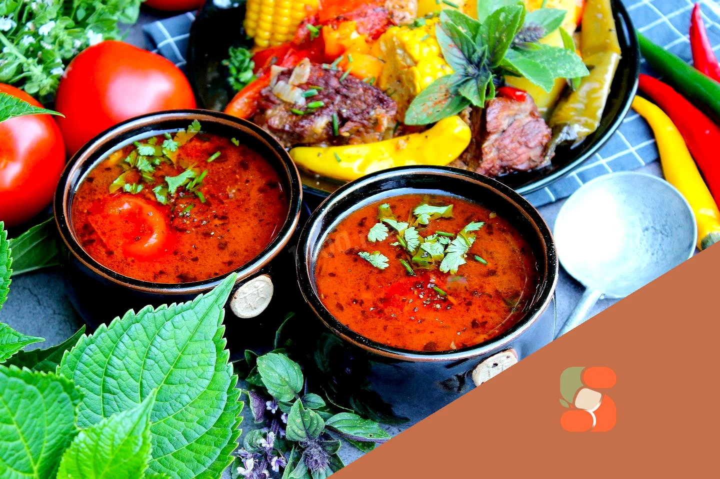 : Каждому в пиалу выложите по помидору и налейте ароматный бульон. Посыпьте нарезанной кинзой или петрушкой. На широкое плоское блюдо выложите шумовкой мясо, кукурузу и остальные овощи. Посыпьте душистым перцем и зеленью. Подавайте!