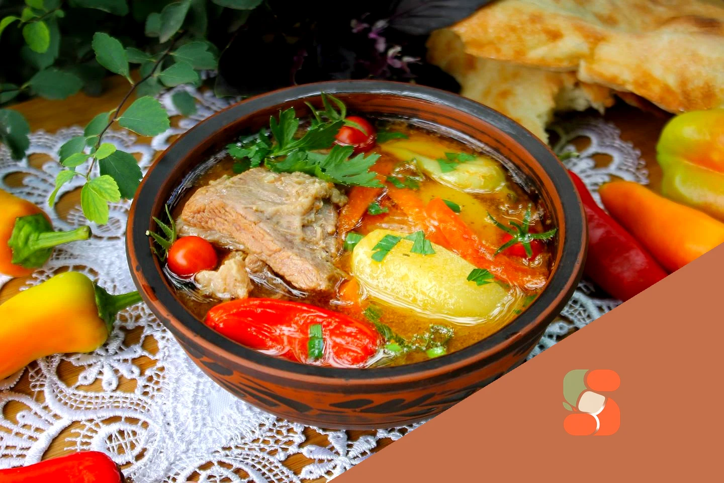 : Шурпа готова! Уберите угли из под казана и оставьте суп настаиваться. Чем дольше шурпа постоит, тем вкуснее она станет. Перед подачей каждому в тарелку предложите насыпать нарезанные петрушку и зелёный лук. Поперчите по желанию.