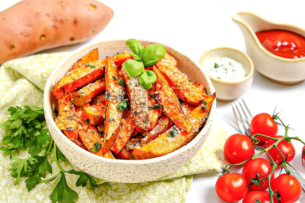Як подавати солодкий батат? Готову страву посипте ще трохи сиром та зеленню, доповніть соусом на ваш смак та свіжими овочами. Подавайте як гарнір або закуску. Приємного апетиту!
