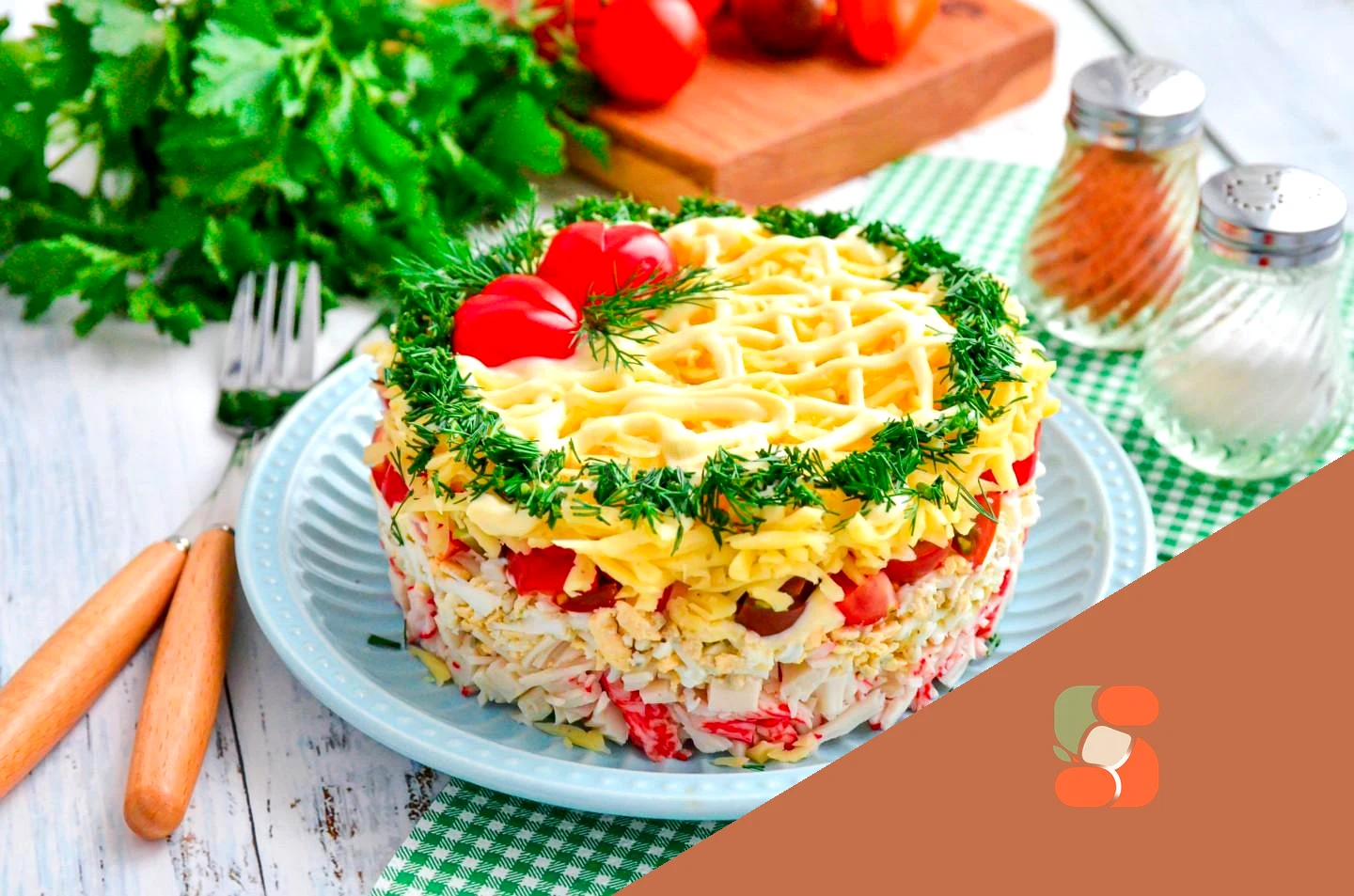 : Помидори помийте, обсушіть та наріжте дрібними кубиками. Викладіть наступним шаром. Тут майонез уже не потрібний.