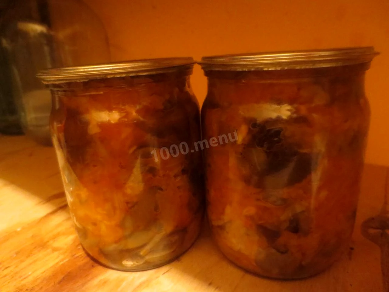 : Додати гриби - за смаком, воду, соус томатний, цукор, сіль, оцет, олія - гасити 2 години.