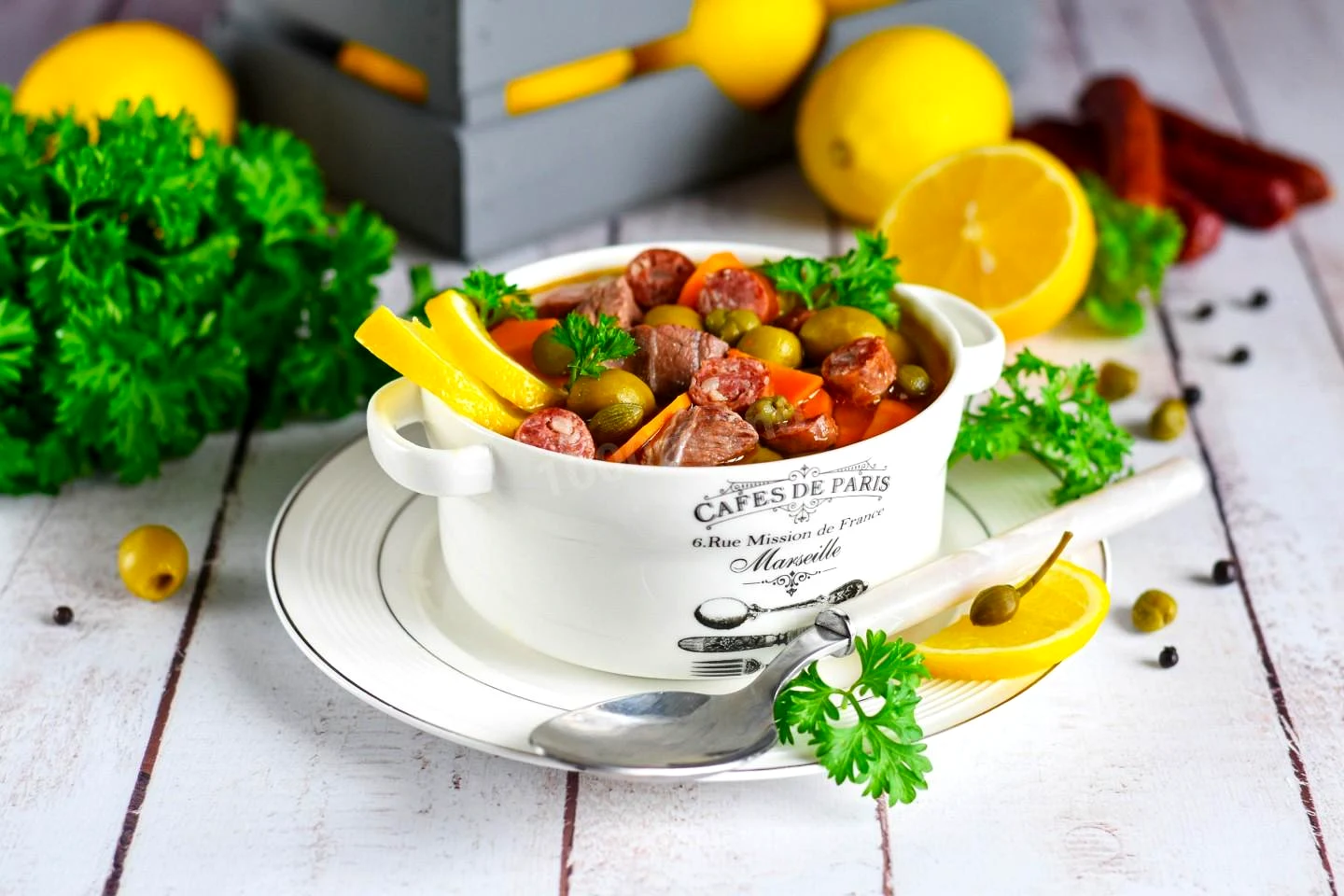 : В кипящую воду выложите промытую говядину на косточке, копченые свиные ребрышки, очищенную целую луковицу, оливки и перец горошком. Варите на среднем огне, снимая пену, 1 час. Количество воды регулируйте по своему вкусу. Хотите более густой суп - берите примерно 2,5 л воды с учетом, что часть испарится во время варки.