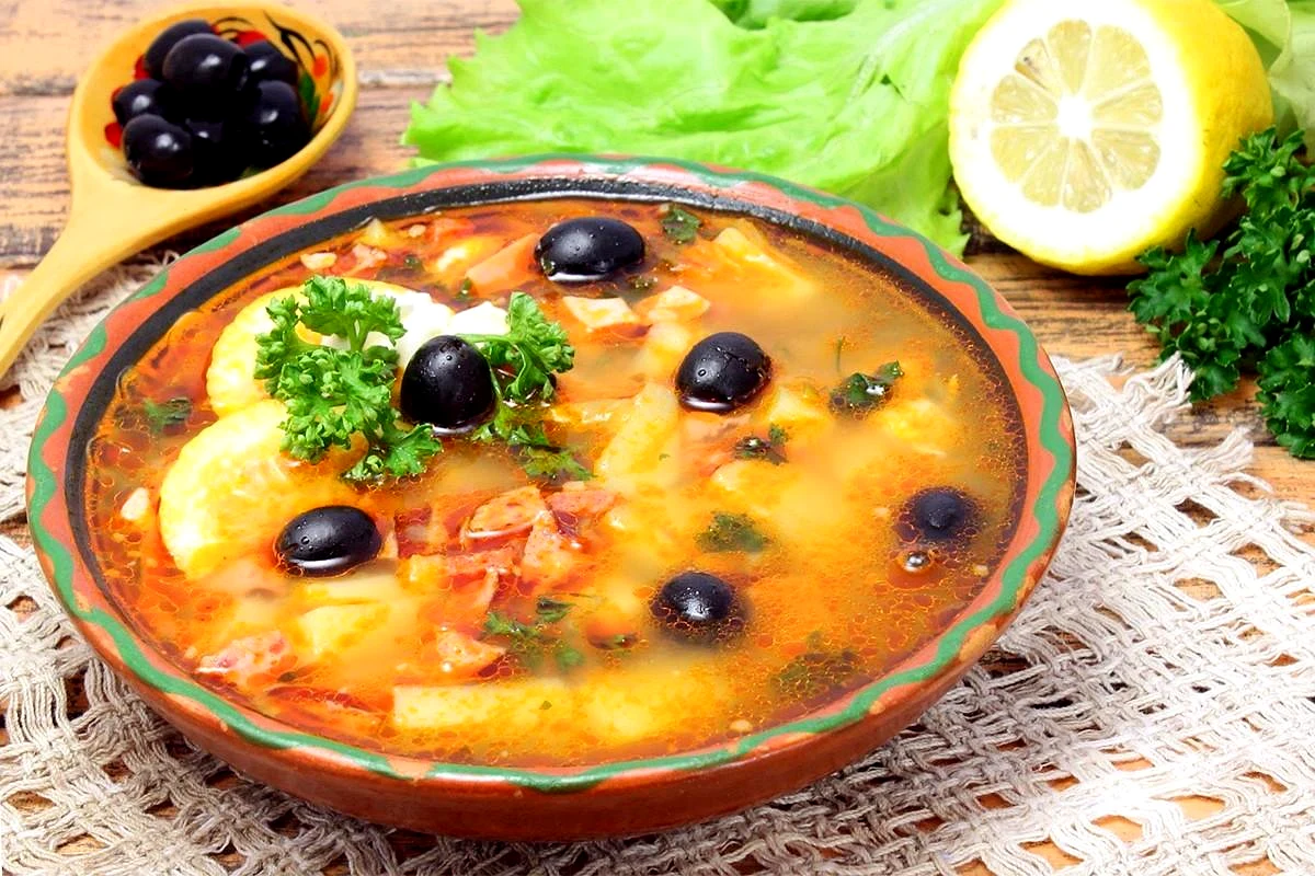 Інгредієнти−8 порцій+Продукти (8 порцій)Яловичина500 грНирки яловичі400 грСосиски200 грШинка200 грМаслини200 грЦибуля ріпчаста1 шт.Картопля1 шт.Солоні огірки300 грЛимони0.5 шт.Базилік40 грВода3 лЗапашний перець5 шт.Чебрець, чебрець10 грВершкове масло50 гр