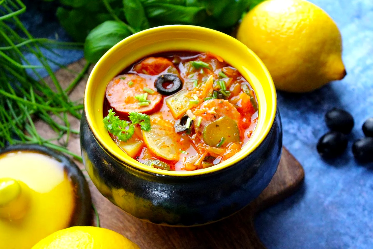 : Отправьте солянку в слегка разогретую духовку. При 200 градусов дождитесь момента закипания бульона, затем температуру понизьте до 160-170 градусов и томите горшочки в духовке до готовности картофеля. Мне потребовалось примерно 1ч.40 мин. - 2ч. За 10-15 минут до конца приготовления добавьте в горшочки измельчённые оливки.