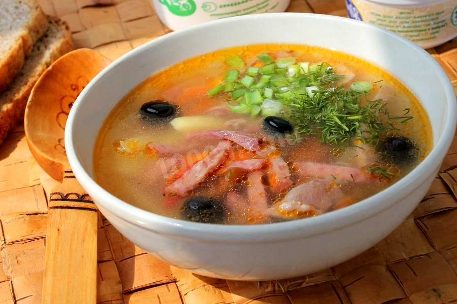Інгредієнти−6 порцій+Продукти (6 порцій)Копчена курка150 грСосиски150 грШинка150 грКартопля200 грЦибуля60 грМорква60 грРослинна олія30 млСолоні огірки150 грМаслини50 грБульйон2 лПаприка2.5 грЗелена цибуля40 грКріп40 гр
